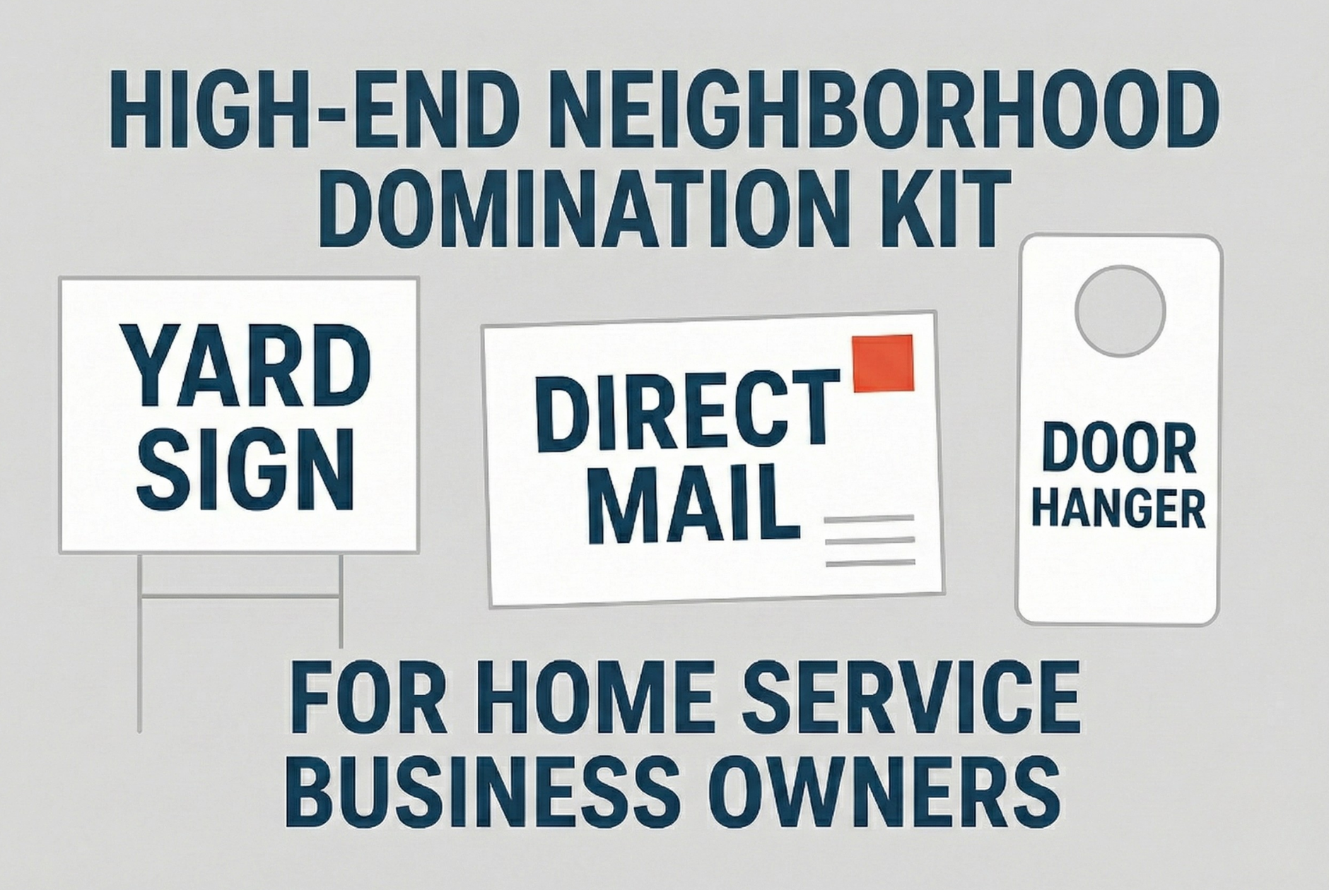 The High-End Neighborhood Domination Kit gives you the exact 3-piece print stack I use in my own companies to take over high-income areas:
